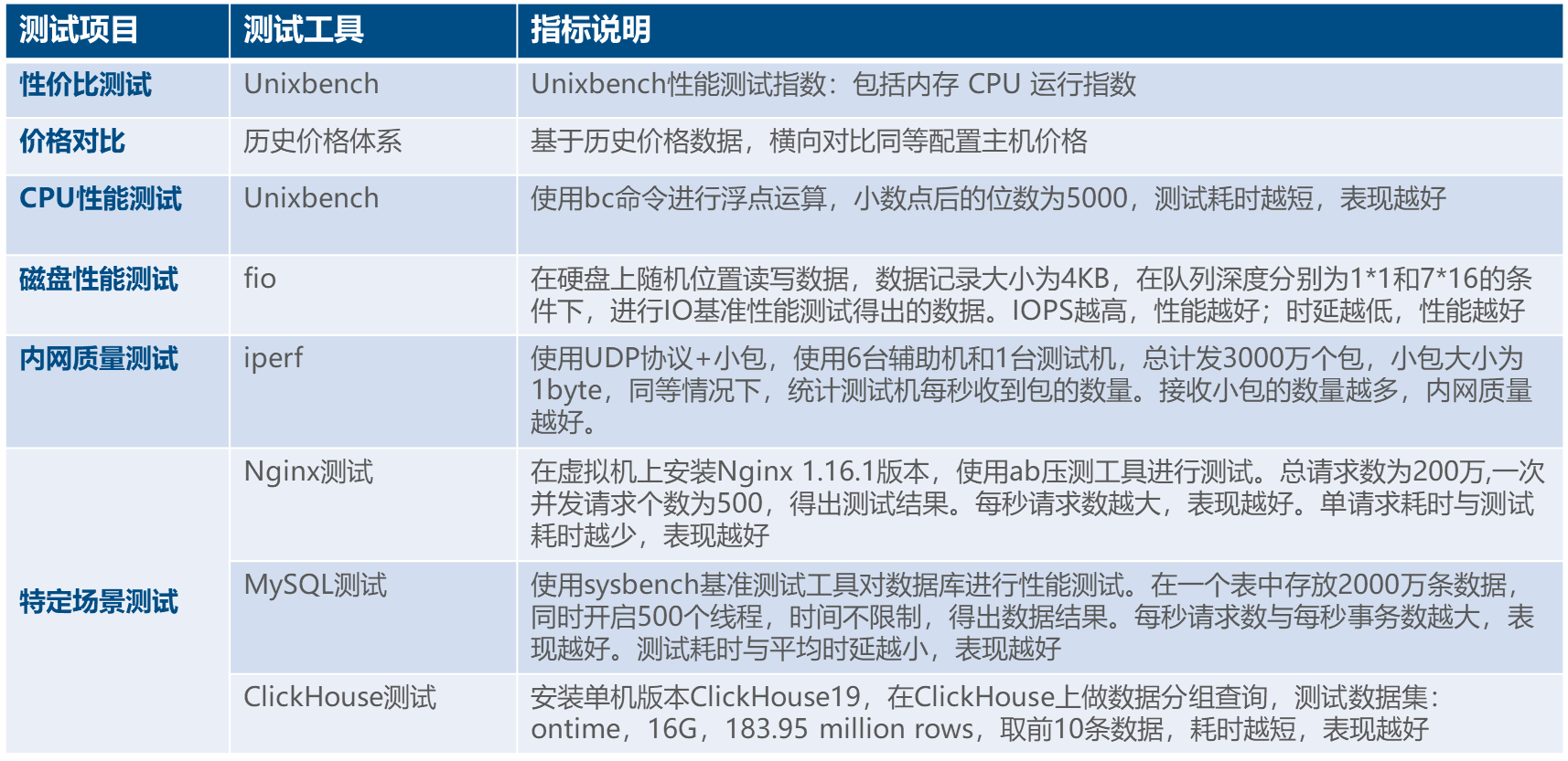 1. 云主机性能共进行3次测试,其中所有的云主机均为新购主机,每完成一次测试空跑8小时以上再进行下一次测试,最终取3次测试的平均值。