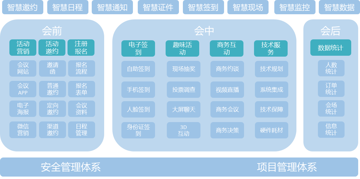 一站式数字会务SaaS云平台,通过覆盖会前、会中、会后,贯通线上线下,结合硬件软件的一站式会议科技产品与服务,实现智慧邀约、智慧日程、智慧通知、智慧证件、智慧签到、智慧现场、智慧监控、智慧数据的会议全流程智慧化