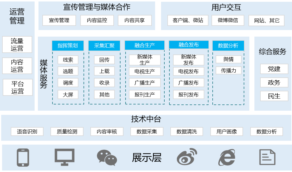 通过融媒体中心建设,实现网站、两微一端等不同渠道的数据打通,提高媒体资源利用率,提升融媒体业务工作效率。