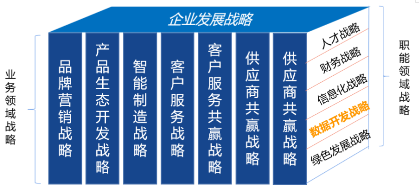 一般地,在企业中有总体的发展战略、分业务领域的发展战略和职能领域发展战略,如图1所示。有的人可能会说,在软件开发、互联网服务、数据运营等现代服务业中信息化战略、数据开发战略也是业务战略啊?是的,这么说也没有问题,我们这里主要探讨的是“制造业”转型升级的问题,是促进制造业高质量发展的背景下来讨论的具体场景。